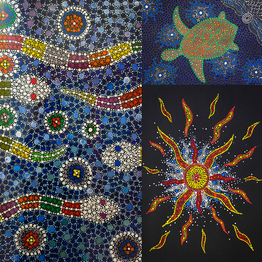 Oikeassa ohjauksessa jokainen osaa tehdä australialaista tai aasialaista taidetta. Jaksolla käsitellään Aasian, Amerikan, Afrikan ja Australian kuvataiteiden historiaa ja nykypäivää. kykyä arvioida erilaisten kulttuuri-identiteettien erilaisuutta ja yhdenmukaisuutta. Kuvassa opiskelijoiden aussitaidetta.